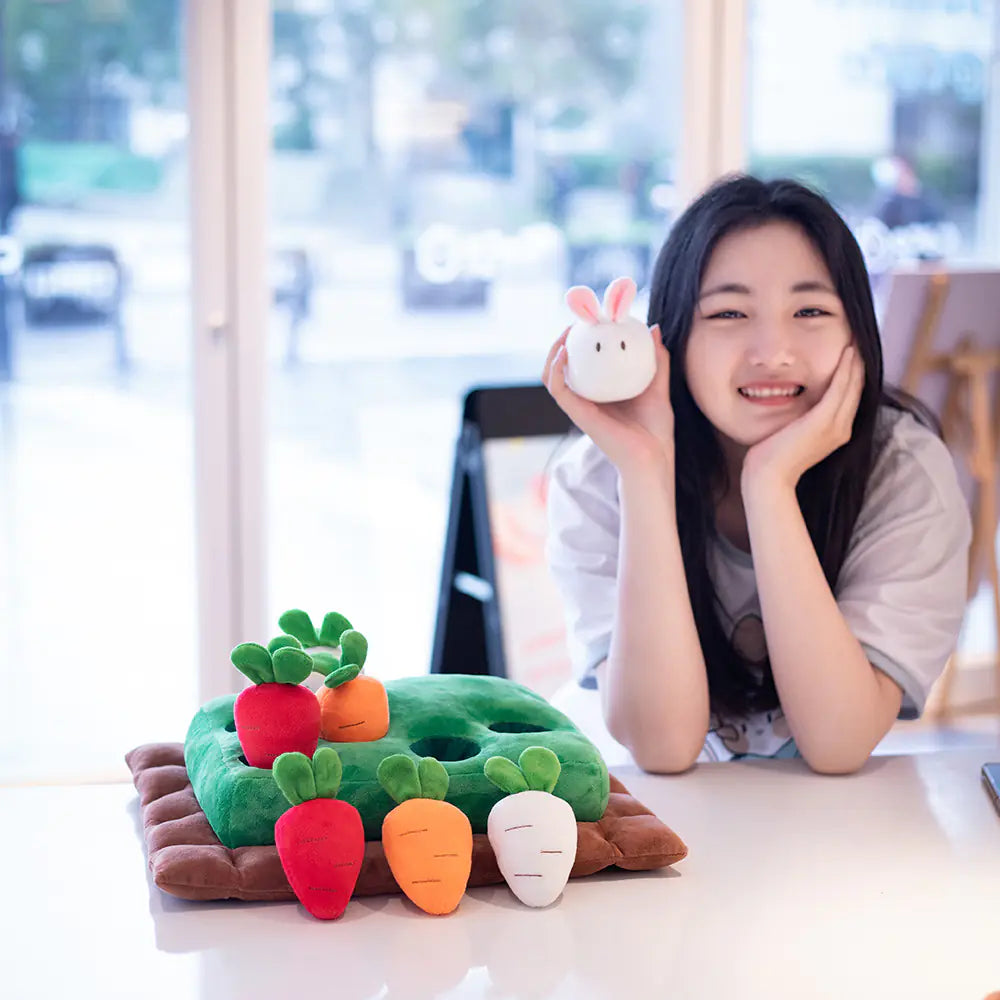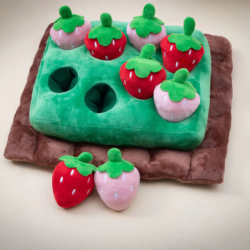Crafted from high-quality plush material, this toy features a charming chickens, vibrant carrots, and a variety of playful strawberries. Your pet will love the thrill of discovering the hidden treasures among the eight holes of strawberries and artificial carrots.